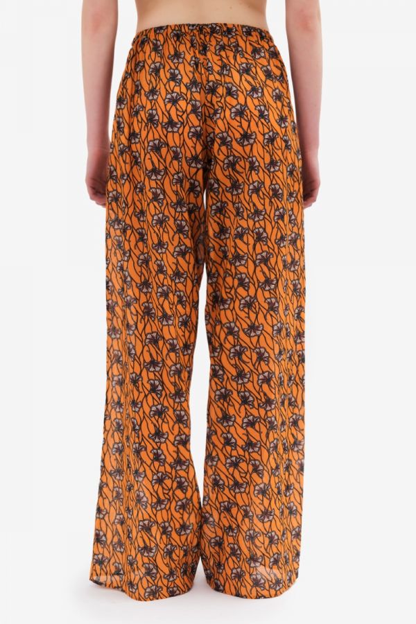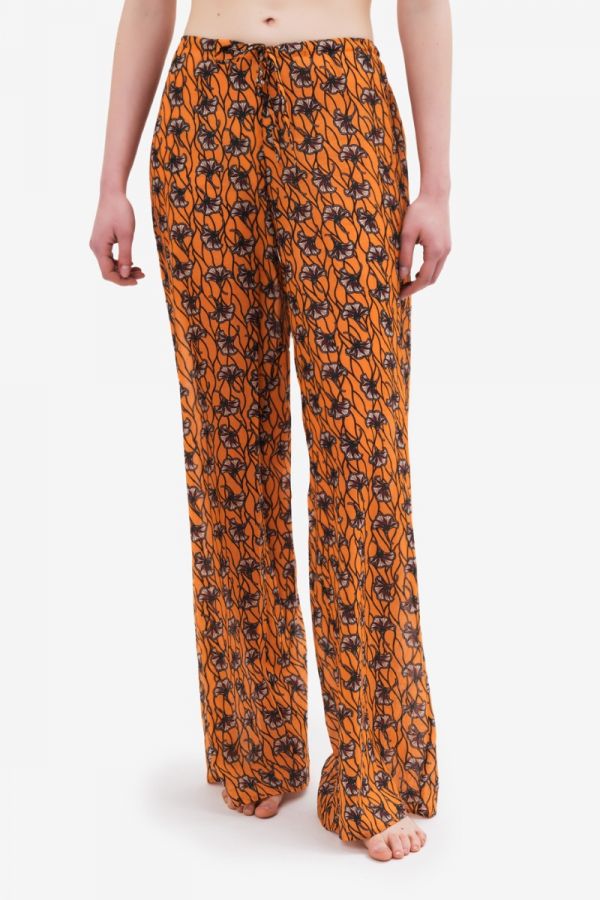 Pajama-cut trousers with straight and soft leg in cotton voile with floral print, elastic and drawstring at the waist.