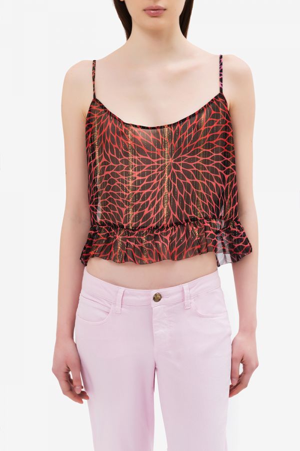 Short top in contrasting foliage pattern with ruffles on the bottom