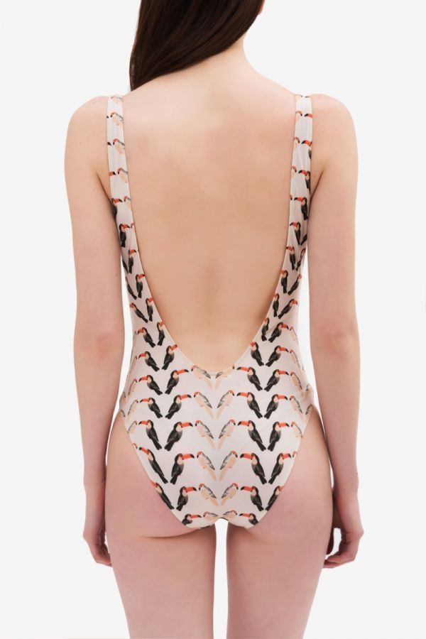 Olympic swimsuit, unlined, in Toucan printed lycra with a round neckline on the neckline and deep on the back.