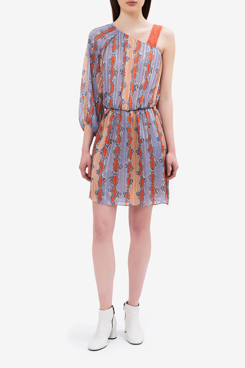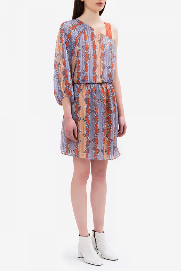 Short asymmetrical dress with waist belt, wide sleeves and multicolor snake pattern