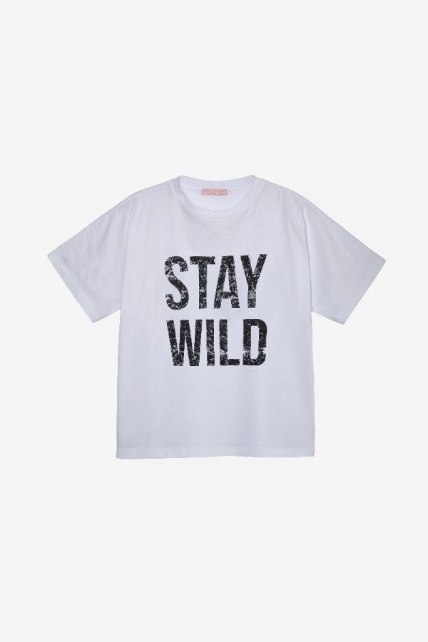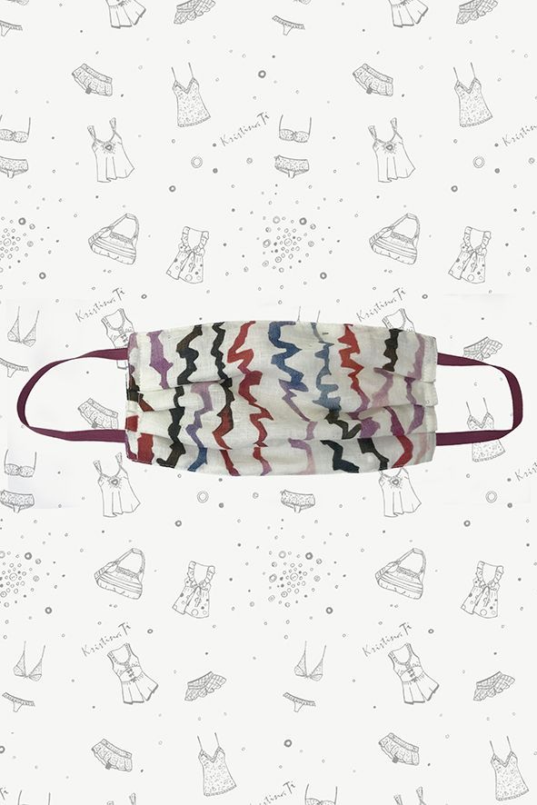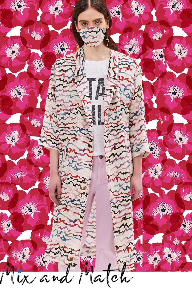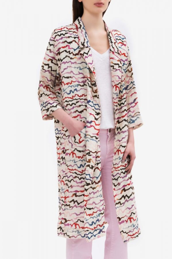 Midi duster in linen canvas, multicolor "eclectic-lines" print, slightly over-shaped with deep slit on the back, welt pockets and maniche sleeves + cotton t-shirt with vintage effect print "Stay Wild" regular fit + ELIDE KTIMASK in the same fabric as the duster.