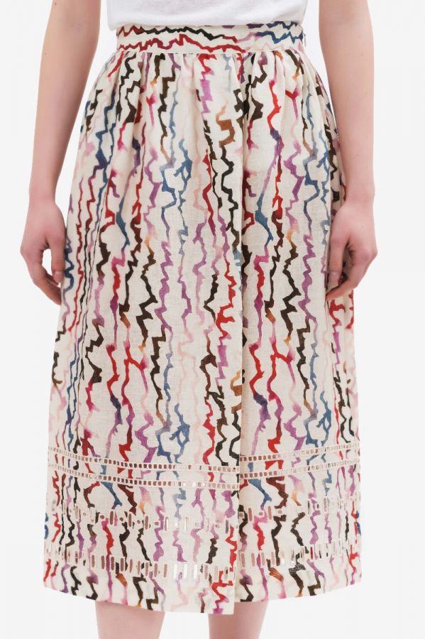 Long skirt in natural fabric with contrasting multicolor pattern