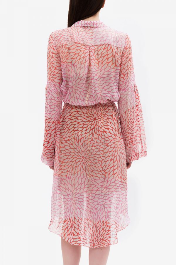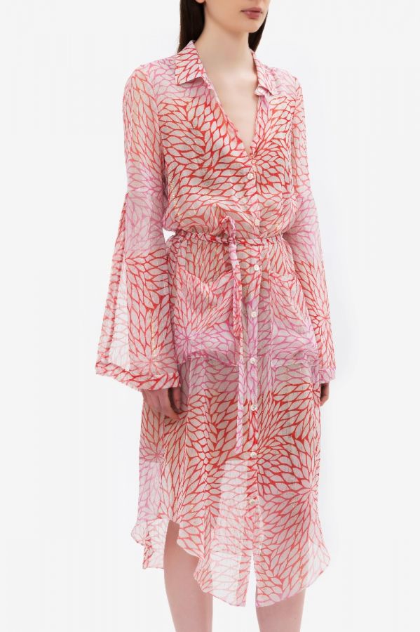 Long oversized shirt-style dress in contrasting foliage pattern with front pockets and male-cut collar