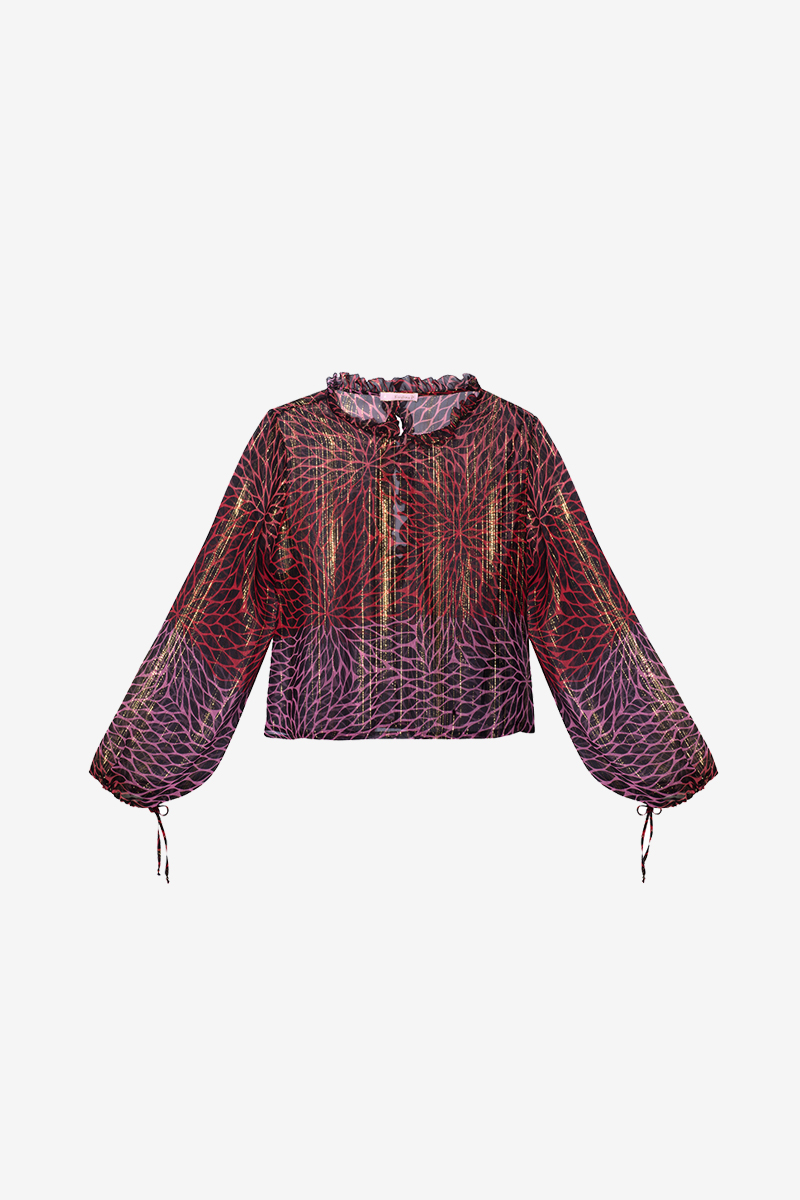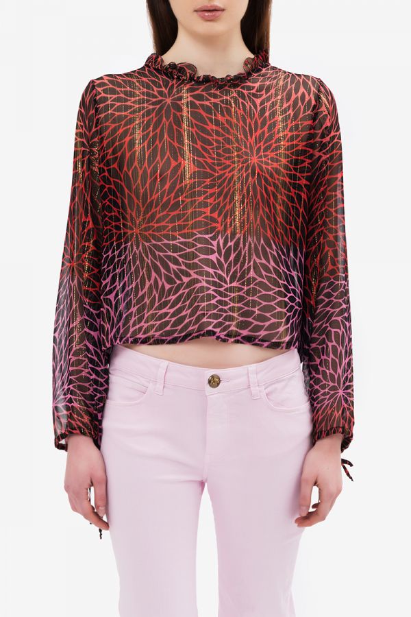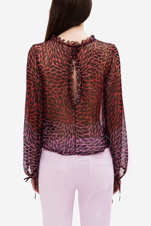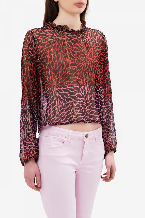 Multicolor foliage shirt with long sleeves and ruffles on the crew neck