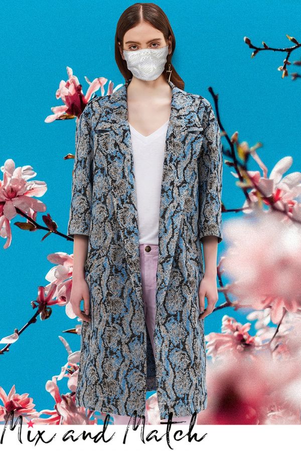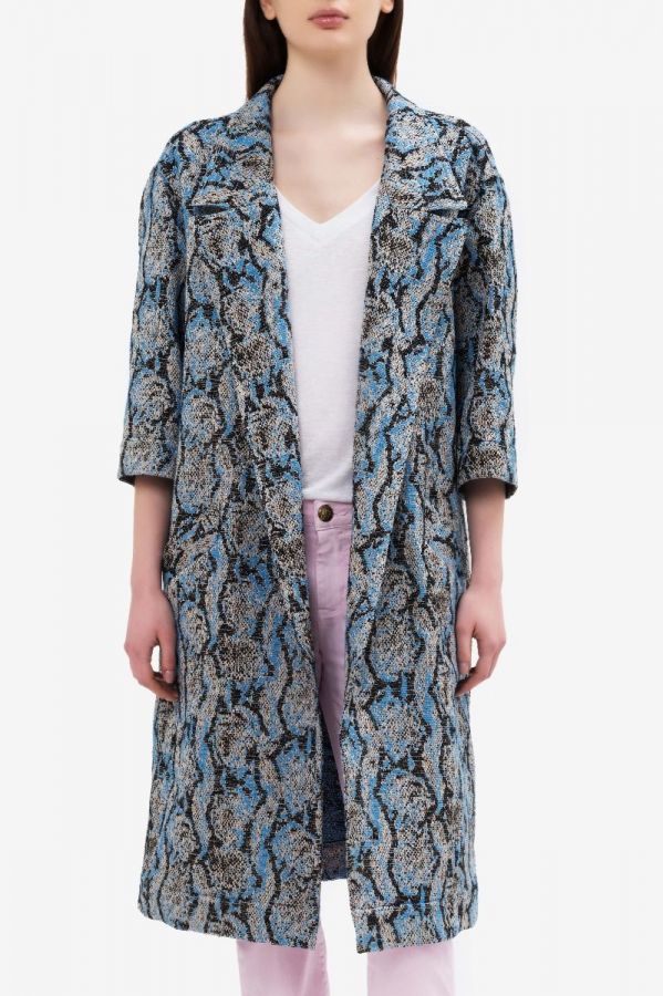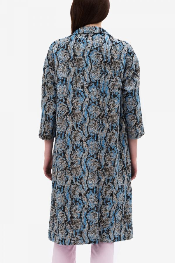Unlined duster coat in python animalier effect jacquard in shades of blue, white and black streaks. Midi length and soft fit. Large lapel, ¾ sleeves and welt pockets. The duster coat is combined with SABINE KTIMASK in white lace.