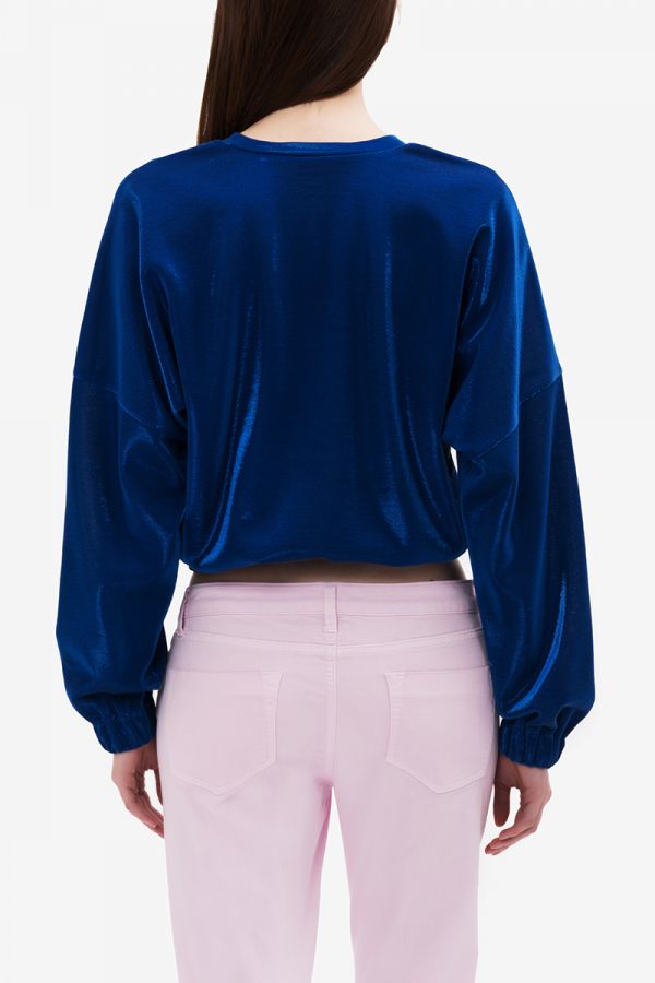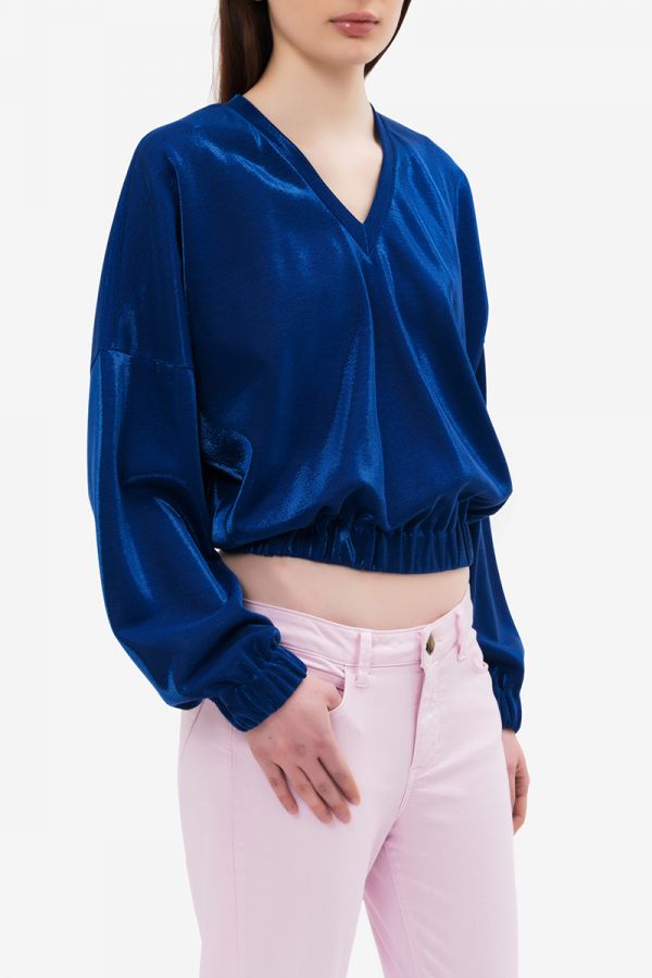 Linear sweatshirt with deep V-neck and gathered elastic at the waist